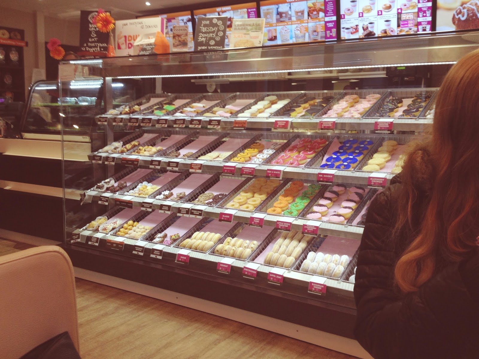 Um kurz vor 8 am Morgen habe ich mich mit meiner besten Freundin getroffen und wir sind zusammen in den Dunkin' Donuts in Bamberg gegangen. Da unsere Klasse momentan nämlich auf Malta ist, wir aber daheim geblieben sind, müssen wir diese Woche trotzdem in die Schule (= schulische Ausbildung). Wir sind diese Woche insgesamt nur zu fünft, das heißt, regulärer Unterricht lohnt sich überhaupt nicht. Deshalb unternehmen wir bis Freitag jeden Tag irgendwas spaßiges. Heute hat die Schule erst um 08:45 Uhr angefangen, also hatten wir noch ganz viel Zeit, uns davor zu unterhalten und einen Chai Latte mit Vanille zu trinken.